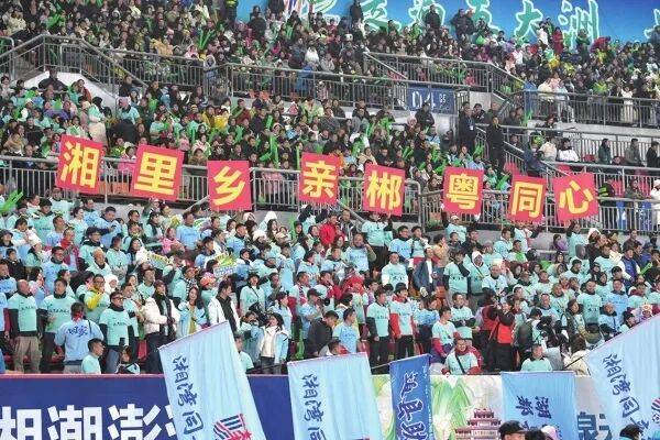 这份归乡的热忱,早已铺垫许久。自“湘超”开赛以来,郴州赛区便向大湾区游子敞开怀抱:2025年9月深圳福田的巨幕广告上,“乡愁是一张9.8元的‘湘超’球票”的召唤直击人心;国庆前后的赛事中,数百名大湾区球迷组成助威方阵,用呐喊为家乡球队注入力量。