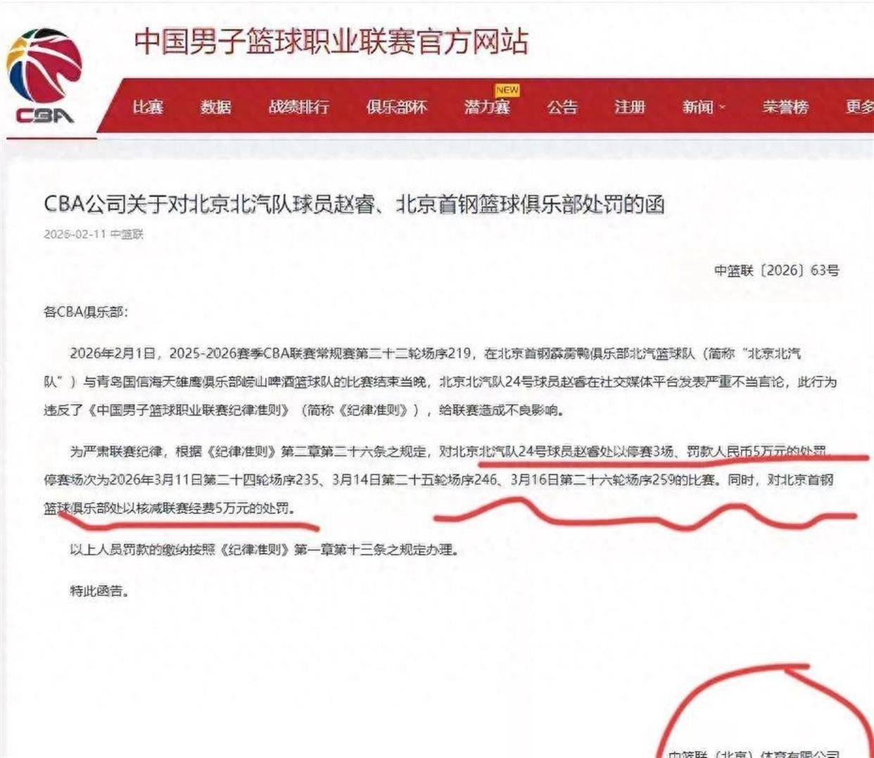 湘超联赛,湖南足球联赛,湘超赛程,湘超直播,湘超积分榜,湘超球队/湘超联赛为湖南足球迷提供最新赛程、实时比分、积分榜排名、球队信息和直播入口,掌握最新赛事动态,畅享足球激情。2026年2月11日深夜,CBA官方一纸罚单引爆篮球圈:北京首钢球员、中国男篮队长赵睿因在社交媒体发表不当言论,被处以停赛3场、罚款5万元的处罚,其所属俱乐部也被核减联赛经费5万元。这张总额10万元的罚单,却未能平息舆论风波,反而让争议持续发酵。